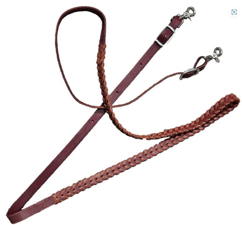 100% Leather, barrel reins, braided in middle for better grip. 3/4″ wide 1 piece rein, 7 feet long and adjustable. Leather roping rein